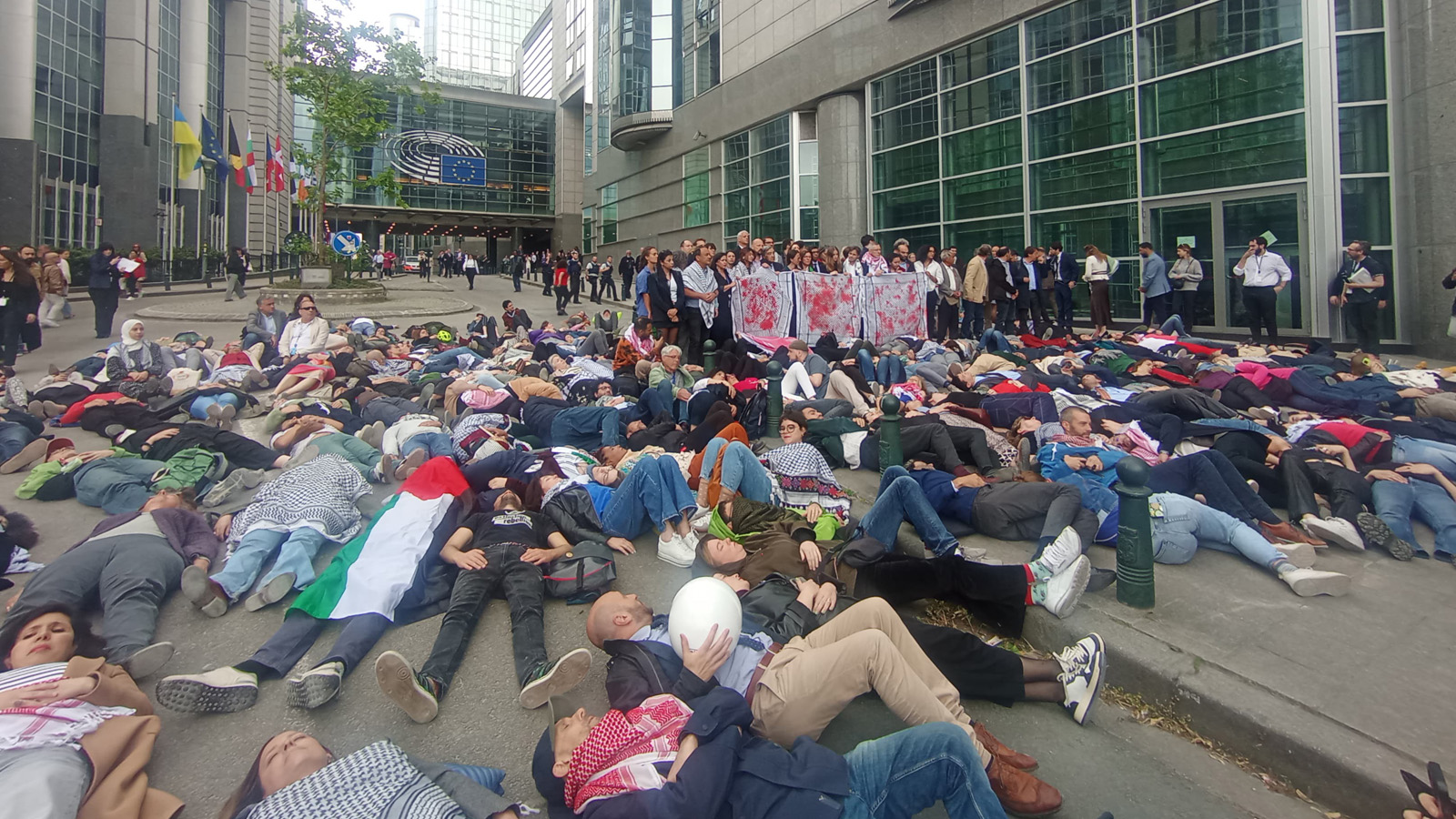 Οι συγκεντρωμένοι ξάπλωσαν συμβολικά στο οδόστρωμα αποτυπώνοντας με αυτό τον τρόπο ότι καθημερινά συντελούνται δολοφονίες Παλαιστινίων και ζήτησαν άμεσα να σταλούν νερό, τρόφιμα, φάρμακα, γιατροί για να αντιμετωπιστεί ο λιμός όπως και την άμεση διακοπή της Συμφωνίας Σύνδεσης ΕΕ-Ισραήλ.